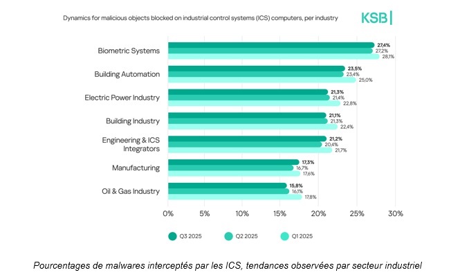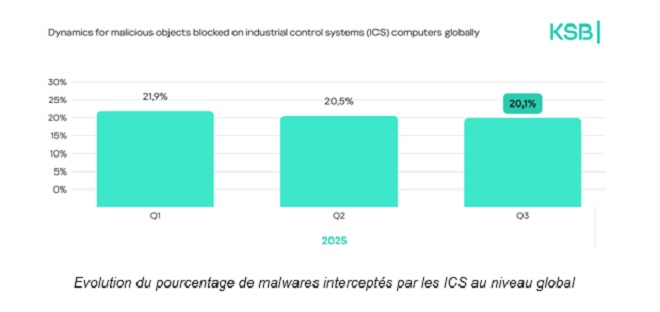 L’année 2025 a été marquée par une pression constante sur les environnements industriels, avec une complexification croissante des menaces mondiales. Le Kaspersky Security Bulletin révèle que la proportion de systèmes de contrôle industriels (ICS) ciblés par des malwares est restée significative, autour de 21,9% au T1 2025, avant de baisser légèrement à 20% au T3 2025. Cette tendance témoigne d’une amélioration progressive des défenses en matière de cybersécurité au sein des organisations industrielles. On observe toutefois des disparités régionales notables : l’Afrique, l’Asie du Sud-Est, l’Asie de l’Est, le Moyen-Orient et l’Asie du Sud enregistrent les taux les plus élevés d’ICS touchés.