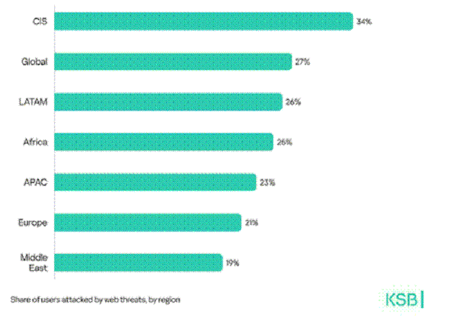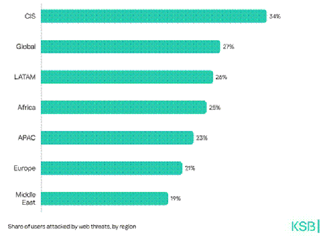 Au niveau mondial, 27 % des utilisateurs ont été touchés par des menaces Web des attaques visant les internautes au cours de leur navigation. Même s’ils ne se limitent pas uniquement à l’activité en ligne, ces malwares nécessitent toutefois à un moment ou un autre de recourir à Internet pour causer des préjudices.